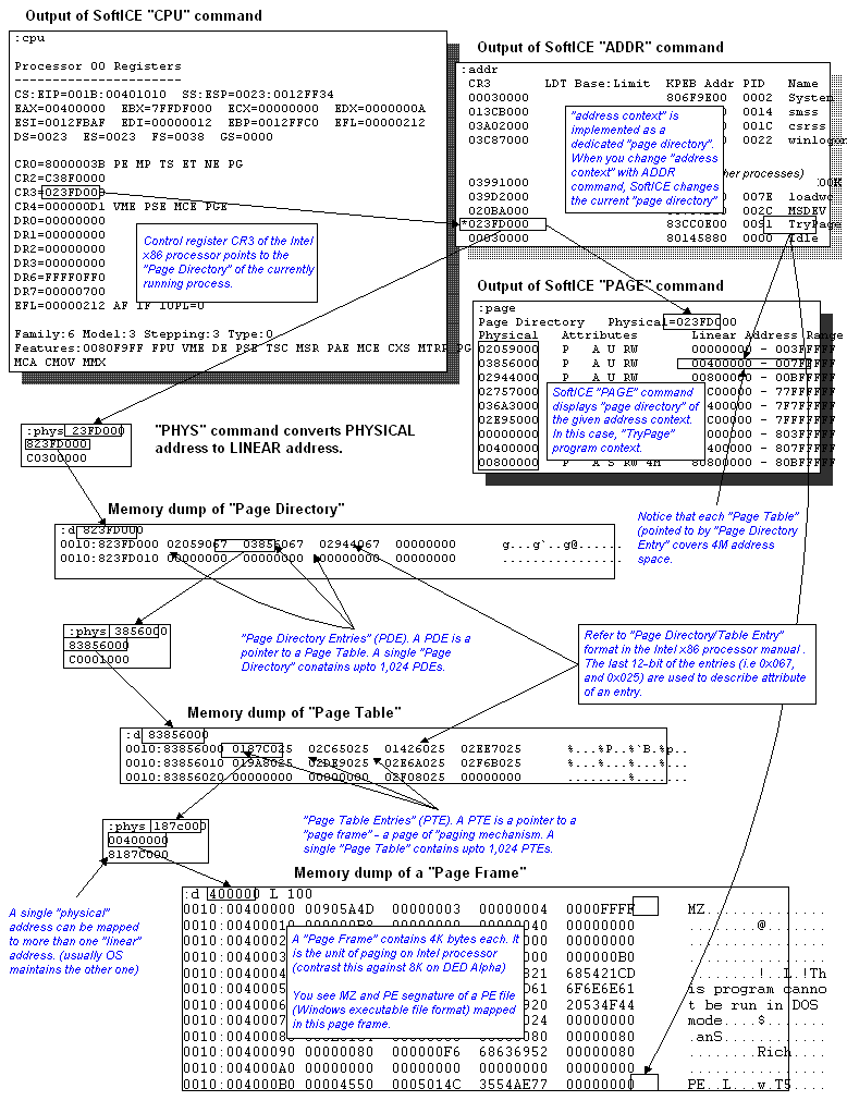 Walking "page directory" with SoftICE - understanding "address context".A 32-bit application program running under Windows NT is given its own process space for its exclusive use. With this separation of address spaces, it eliminated a possibility of accessing physical momory that another application may be using.This "process space" is also called "address context" and it is implemented by assigning a dedicated "page directory" to each application. Note that "page directory" is a term which is a part of the Intel x86 paging mechanism which Windows uses to implement its "virtual memory" functionality. SoftICE "ADDR" command lists all the running processes and their "page directories". At any given moment, there can be only one "address context". The processor keeps track of current process by caching a "page directory address" in its control registers, CR3. Issue "CPU" command to see the content of CR3. A "page directory" is a table of pointers to "page tables". (Yes, this is little confusing and you should refer to Intel x86 processor manual. It contains many useful diagrams.) Each "page table" is a table of pointers to "page frames". A page frame is a 4K-byte size "page" which contains actual bits.