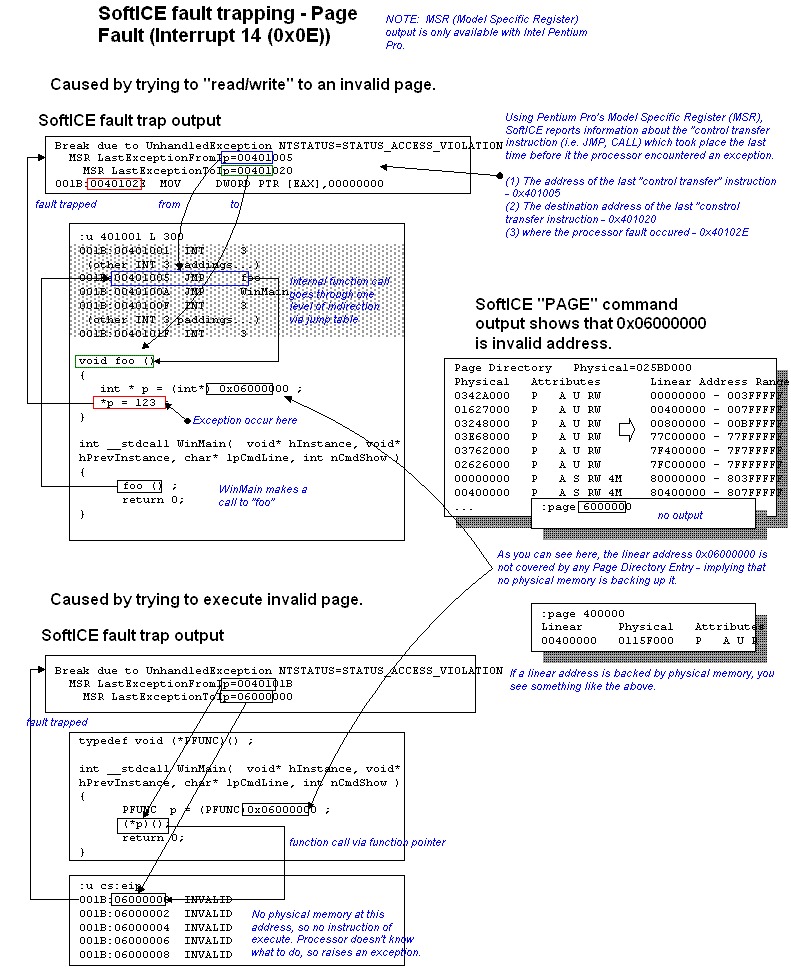 Two ways to cause "page fault" situations, and how SoftICE reports it.When Windows NT reports "Access violation", it is saying that the processor detected a page fault condition. Windows NT does not use the term "page fault" in order to "abstract" the concept (so that it support other processors).A "page fault" is a situation where the processor's "page-level protection mechanism" detected a fault. The processor uses its "paging mechanism" for "linear address" to "physical address" convertion, and it performs "protection check" during the conversion. A "page fault" could be a normal part of "virtual memory" mechanism that Windows implement. For instance, if certain pages are not used often, then it could be "swapped" out to a disk-based "page file". Next time a program try to access it, the processor detect a page fault, which is appropriately handled by Windows' built-in "page fault handler". It is a kind of page fault which is perfectly normal and happens all of the time. A "page fault" become fatal only when a program access a page that is never being backed by a physical storage (neigher memory nor swapped disk-based page). It is simply accessing "nowhere". In general, you can cause a page fault either by trying to read data from a memory location or by trying to execute at a memory location. In both cases, if no physical page is assigned, Windows page fault handlers says "I don't know what to do with this...". What happens next is that you will see the familar "Program Error" dialog box reporting ACCESS_VIOLATION. SoftICE traps this before the default "Program Error" dialog box popps up. If the processor is equipped with MSR (model specific register) - Pentium Pro has it - then SoftICE also prints the contents of MSR as well. The following figure shows how page faults caused by both "memory access" and "memory execution" are trapped by SoftICE, and how its outputs relate to actual program behaviors. Real-life page fault is not this simple, but at least you see how SoftICE output try to give clues.
