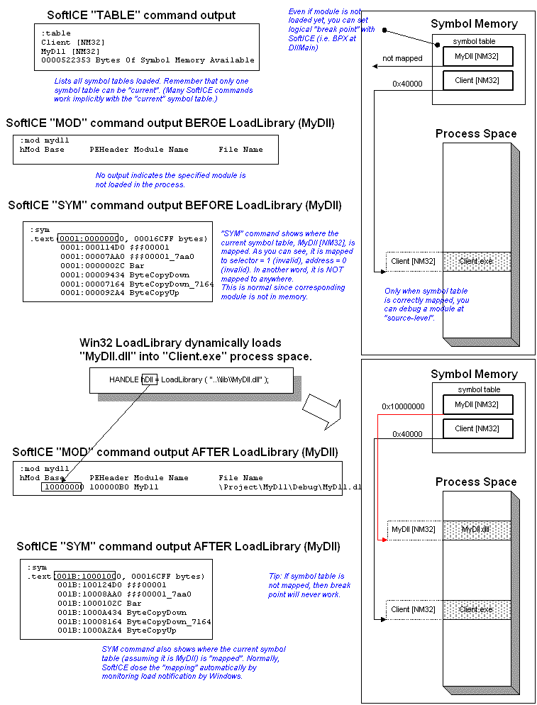 "Symbol Table" - the most important thing for source level debugging with SoftICE.SoftICE is capable of disassembling instructions at any given address (assuming that address actually points to a valid byte stream of instructions). With just this capability, an assembly language programmer could use SoftICE quite effectively. However, most modern programs, both applications and even drivers, are written in high-level languages, and it becomes quickly unrealistic to try to debug a program without source files.To setup for a source level debugging, you MUST load symbol table (and of course associated source files), and the symbol table must be correctly mapped to the load address of the target module. The figure below demonstrate this concept of "mapping a symbol table at load address". Suppose you want to debug a DLL, "MyDll.dll" which is dynamically loaded by an client application, "Client.exe". First thing you have to do is to "pre-load" the symbol table for your DLL. Remember that DLL cannot be started by itself. It needs a "process space" to which DLL is loaded into. When symbol table of "MyDll.dll" is pre-loaded into memory, and even after the client program, "Client.exe" is loaded, the symbol table for "MyDll" remains "logical" - meaning that symbols point to nowhere. You see a process space created for an application, "Client.exe", and symbol table for "Client.exe" is already mapped to the load address of "Client.exe". SoftICE does this mapping automatically when "Client.exe" is loaded. If you look at the output of "SYM" command while "MyDll[NM32]" is selected as the current symbol table, you notice that ".text" section is mapped to address 0001:00000000. If you issue SoftICE GDT command, you will learn that the selector value of 0001 is invalid. In other words, "MyDll[NM32]" symbol table is not mapped to anywhere. Now, after "Client.exe" calls Win32 API LoadLibrary to load "MyDll.dll", SoftICE automatically "maps" the symbol table by setting the base address of the symbol table to the "load address" of "MyDll" - in this case, it is 0x10000000. Once this mapping occur, you can symbolically debug "MyDll" at source level. Common problemSometimes, you experience breakpoint not going off, even if symbol table and associated source files are loaded. If this happens, first, make sure that symbol table is "mapped" to the load address using "SYM" command. If "SYM" command list address like "0001:00000000" or "0002:00000000", then you know that it is not mapped correctly. No breakpoint will triger since execution never occur at that address.This could be caused by a number of reasons including "limitations" of SoftICE (see below). However, there is a workaround for this situation: use SoftICE command "SYMLOC" to do the "mapping" by hand. Syntax of SYMLOC asks you for (1) section, (2) selector, and (3) base address. (1) section is almost always value=1 because most programs have CODE section as the first section. (2) is almost always either 0x08 or 0x1B. If your program is "user-mode" application, then use 0x1B, if its a "kernel-mode" driver, then use 0x08. You can find out the base address of a module using either "MOD", "QUERY", or "DRIER" command. !Limitation!Unfortunately, there exists a limitation with the current symbol table architecture of SoftICE: SoftICE cannot distinguish two modules by thier file extensions. For instance, if you have "test.exe" and "test.dll" and "test.sys" with all modules loaded at the same time. Only one symbol table named "test[NM32]" is allowed to be loaded. Furthermore, the "load address" is determined by the order of loading - SoftICE uses the address of whatever loaded at last for mapping.