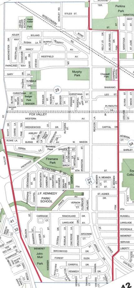 Zone 12 encompasses the area shown below. It is bordered on the East by Fisk Street, on the South by Lombardi Avenue, on the west by US 41 and Taylor Street, and on the North by the Village of Howard.