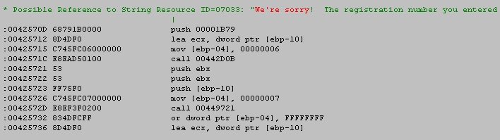 Now, this isn't always the easiest way , but in this case it is very simple to trace back in W32Dasm. So, fire up W32Dasm and disassemble pro.exe. Search for the text from your bad reg message. You should see :-