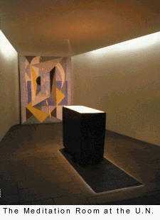 The UN Meditation Room And finally, we come to the pictures of the UN Assembly hall and the UN meditation room. Notice the similarity of the barren look and sterile feel in the UN meditation room, the masonic temples, the Anglican Churches, and the Vatican II "New Order" "Catholic" Churches. On the left immediately below is the UN Meditation Room. On the right is a picture of Paul VI sitting beneath three UN officials right before he spoke at the UN assembly in 1964. (The entire view of that picture reveals Paul VI is sitting beneath three men who are sitting in chairs much like those which have replaced the tabernacle in "New Order" "Catholic" churches.