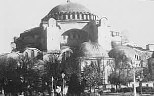 Left: Constantine, the bringer of Christianity to the Roman Empire, and therefore also ultimately to Europe. The city he was to found, Constantinople, would last until 1453, when it was overrun by the Nonwhite Muslims. Right: A view of the Haga Sofia - the Christian church built in Constantinople by the Eastern Roman Emperor Justinian in 537 AD. When Constantinople was overrun by the Nonwhite Muslims, four Muslim towers, called minarets, were added to the corners of the building. In this photograph, the minarets have been removed to present the building as it was when it was built.