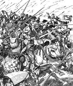 About 5,000 English longbowmen took part in the battle of Crecy - a good bowman could fire seven arrows per minute. This meant that the French were showered with 35,000 arrows per minute, cutting down men, horses and traveling with enough velocity to pierce all but the heaviest armor. Contemporary accounts have it that 'arrow flights darkened the sky' and this must have been very close to the truth. Only with the rise of firearms was the longbow finally made redundant. Below: An accurate depiction of the receiving end of the longbow - this illustration of French ranks at the battle of Agincourt in 1415, shows the slaughter inflicted upon the hapless French knights, long before they could close to combat.