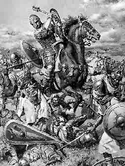 William of Normandy in action at the Battle of Hastings, 1066. William was a direct descendant of Rollo the Viking, who settled in France at the invitation of the French in an attempt to stave off further Viking attacks. Due to a series of family links, William ended up being a claimant for the English throne when the reigning English King Edward, died heiress. Leading a Norman, French speaking, army across the English channel, he landed in south east England and at the battle of Hastings, defeated the English claimant to the throne, Harold of Essex. In this way a Viking descendant became King of England. The depiction of the battle scene follows the accurate detail of the Normans having long shields, as opposed to the round ones the Britons carried.
