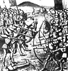 The secret weapon which enabled England to win at least two important battles with France - the longbow. Developed in Wales, the longbow was capable of firing an arrow over a much greater distance than conventional bows. This illustration above purports to be that of the Battle of Crecy in 1346, where the English defeated the French with the use of the Longbow. English longbow archers on the right, face the French crossbow archers on the left. The illustration is inaccurate, as the longbow archers stood far behind the front ranks, way out of danger's immediate reach - and showered the French with arrows long before they could reply.