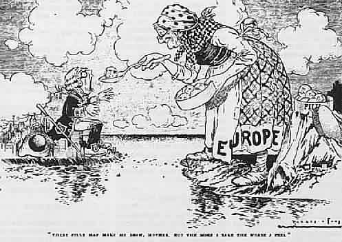 This cartoon, which appeared in the prestigious American magazine Life of 5 October 1911, reflected a popular concern at the large numbers of Jewish emigrants from Europe into the United States. The "child", America, is being fed Jewish pills by Mother Europe, and complains that the "more I take, the worse I feel". That such a cartoon appeared in a well known mainstream American magazine indicated the level of the public debate on the issue of Jewish immigration into America.