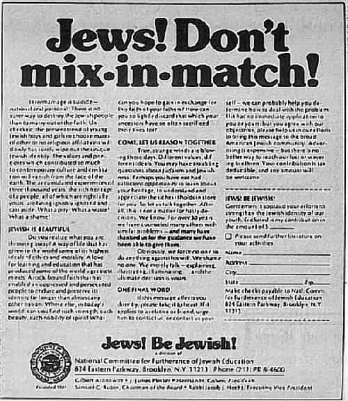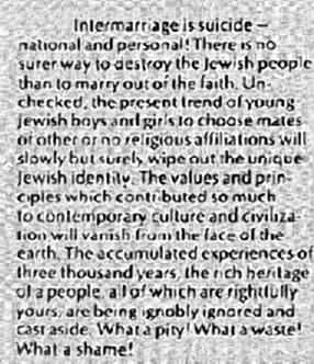 The continued existence of all groups is under threat: here is an advertisement which was placed in the Jewish newspaper, The Jewish Press, of 26 January 1973, which quite correctly points out that the Jewish culture will disappear if Jews marry outside of the Jewish people. (extract below). The advertisement, placed by an organization calling itself "Jews! Be Jewish" points out that mixing will lead to the disappearance of the Jews. The advertisement then draws the logical conclusion and urges Jews not to intermarry. This principle is absolutely sound if the Jews, or any other group for that matter, do not want to vanish.