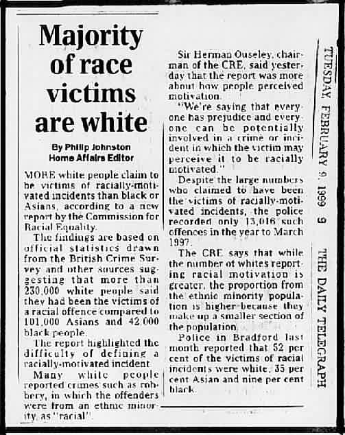 However, according to the British Commission for Racial Equality, more Whites are the victims of race attacks than Asians and Blacks added together. (Daily Telegraph, London, 9 February 1999).