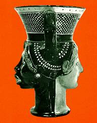 Above: Classical Greece lasted from 800 BC to 400 BC. Its fall can be traced to a shift in population make-up which occurred there from 500 BC onwards, when the first Black slaves and Black freemen began to enter that society. Within 100 years of Blacks becoming commonplace in ancient Classical White Greece, that civilization collapsed. Two original depictions, both dating from circa 500 BC, show the trend clearly: Left, a vase depicting a Negroid female, and right, a double headed vase showing a Black and a White face, reflecting the two elements in late Grecian society (see chapter 10).