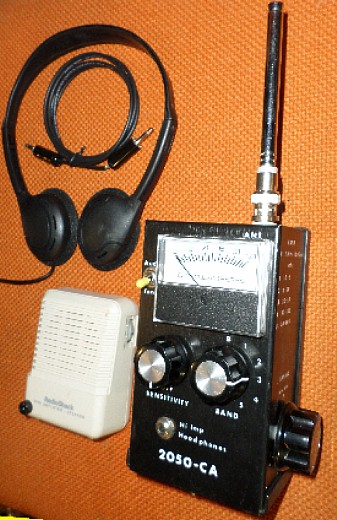 ![]() The 2050CA is an ultra-sensitive hand-held radio frequency (RF) detector with visual and tonal readout of relative signal strength. A six- position BAND switch selects either a broadband circuit or one of five tunable ranges. The meter displays the amplified signal while the HEADSET jack supplies a tone with pitch proportional to signal strength or demodulated audio of any signal with an amplitude modulated (AM) component. In the TONE mode the 2050CA functions much like the well-known Geiger counter. OPERATING INSTRUCTIONS: Connect the antenna to the ANT jack. Extend two or three sections of the antenna using only the heaviest or larger diameter sections. Plug the special 600 ohm headset supplied with the 2050CA into the HEADSET jack.. Place the TONE/AUDIO switch in the TONE position. Apply power by rotating the SENSITIVITY control clockwise to about three-quarters of its range. Set the TUNING control so the white indicating line points directly away from the words LOW END. Start with the BAND switch in position 1. With the antenna held vertically, sweep an area (such as a wall) about 4 to 5 feet wide. Sweep the same area with the antenna horizontal and then perpendicular. Sweep the same area on bands 2 through 5. Move on to the next 4 to 5 foot section. After sweeping the walls, bookshelves, etc. carefully go over every piece of furniture. Get the antenna as close as possible. If the meter goes off scale or the tone goes too high in pitch or stops, reduce the sensitivity by rotating the SENSITIVITY control counterclockwise to no less than 9 o'clock. If that is not sufficient, shorten the antenna one or two sections. The 2050CA locates high power radio or TV stations for up to several miles. It also locates low power signals (1 to 10 milliwatts) at distances of 5 to 25 feet. Bear in mind when searching for low power transmitters that high power signals from AM/FM/TV stations may reflect or reradiate from the least expected places. Use common sense when doing RF sweeps. For additional sensitivity, rotate the TUNING control for maximum meter indication. Use the B position of the BAND switch for broadband detection at lower sensitivity. When in the B position, point the white line on the TUNING control directly away from the words LOW END. Place the TONE/AUDIO switch in the AUDIO position to determine if a detected signal contains audio. The 2050CA may be used in the "feedback mode" by connecting the small audio amplifier to the HEADSET jack using the cable supplied. Turn the volume to a comfortable level and point the speaker towards the area being swept. NOTES: External accessories, such as the 1 to 15 GHz extender antenna, use the unmarked jack on the left side of the unit. Frequencies shown on the BAND chart are approximate and for reference only. Store or ship the unit with the antenna disconnected, the BAND switch in position 5 and the TUNING control pointing toward the words LOW END. A 9 volt Alkaline battery powers the unit for over 500 hours. |