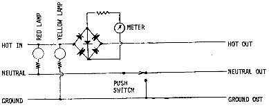 Test the appliance with the power OFF. The AC-50 is protected to loads up to 700 watts. OPERATION: Plug the appliance into the AC-50. Plug the AC-50 into the power outlet. If the line is HOT the RED lamp will light. If the ground is good the YELLOW lamp will light. The YELLOW lamp will NOT light is the HOT and NEUTRAL are reversed or if there is no ground. Read the meter. Press the RED button and read the meter. If there is excessive current through either the neutral or ground paths further checking of the appliance is necessary. ![]() 8/09 |