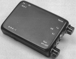 The SCAN23 had its place in time. During the U.S. Capitol grounds riots of the early 70s hand held Citizen Band (CB) transceivers were the communicators of choice for the so called "left." There were so many radios on the air at one time that all 23 of the CB frequencies were usually occupied. The Capitol Police came to me and asked if I could build a device that would indicate transmitter operation on all frequencies all at once. Scanners were out of the question. Thus, the SCAN23 was born. It simultaneously indicated all frequency usage instantly. The unit contained a broadband receiver covering all channels and individual filters which, when activated, would turn on a light for that channel. The police could then watch the light panel and a "leftist" to see which light came on when he or she lifted their transceiver to talk. That channel could then be monitored and "neutralized." A portable CB transceiver was included in the package should the Capitol Police wish to do just that. ![]() The UUA-1 (Utility Audio Amplifier-1) came out of the Intelligence Material Development and Supply Office (IMDSO) at Fort Holabird, Maryland. During the mid 60s it was the state of the art... albeit relatively crude. It contained a few transistors and transformers. I probably produced a few hundred. Then came its replacement, my 1059. Once my 1059 caught on, it was good-bye UAA-1. |