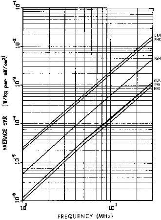 Calculated planewave average SAR in an ellipsoidal model of an average man, for the six standard