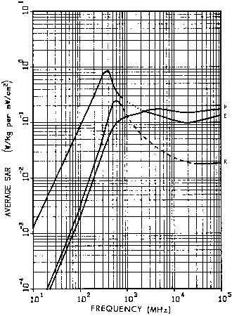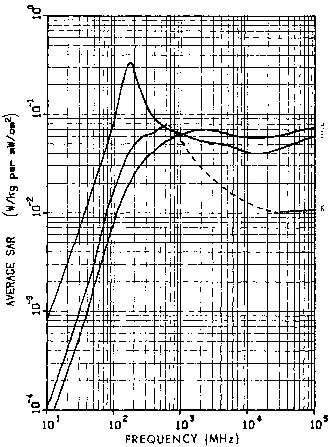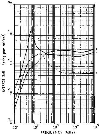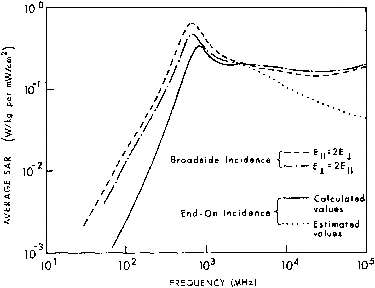 Calculated planewave average SAR in a prolate spheroidal model of an average ectomorphic (skinny) man for three polarizations; a = 0.88 m, b = 0.113 m, V = 0.04718 m3. The dotted line is calculated from Equation 5.1; the dashed line is estimated values.