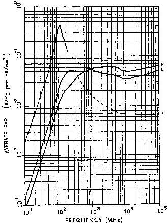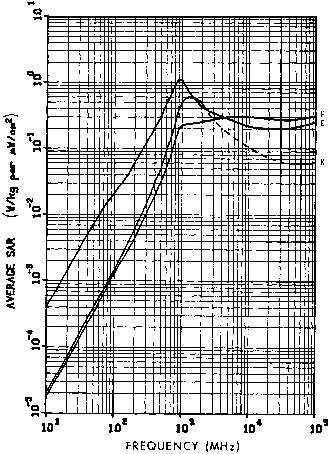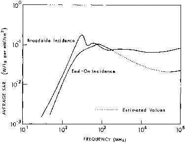 Figure 6.29. Calculated planewave average SAR in a prolate spheroidal model of a sitting rhesus monkey irradiated by an elliptically polarized wave, for,two orientations; a = 0.2 m, b = 0.0646 m, V = 3.5 x 10-3 m3.