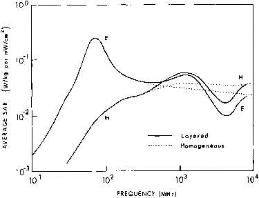 Figure 6.20. Calculated planewave average SAR in homogeneous and multilayered models of an average man for two polarizations.