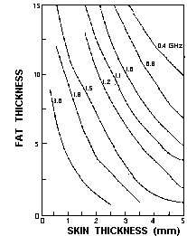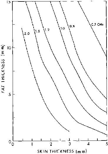 Figure 6.24. Layering resonance frequency as a function of skin and fat thickness for a skin-fat-muscle cylindrical model of man, planewave E polarization. The outer radius of the cylinder is 11.28 cm.