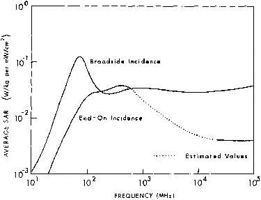Figure 6.25. Calculated planewave average SAR in a prolate spheroidal model of an average man irradiated by a circularly polarized wave, for two orientations; a = 0.875 m, b = 0.138 m, V = 0.07 m3.
