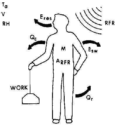 10.1. A schematic diagram of the sources of body heat (including radiofrequency radiation) and the important energy flows between man and the environment