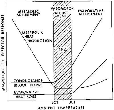 10.2. Thermoregulatory profile of a typical endothermic organism to illustrate the dependence of principal types of autonomic responses on environmental temperature