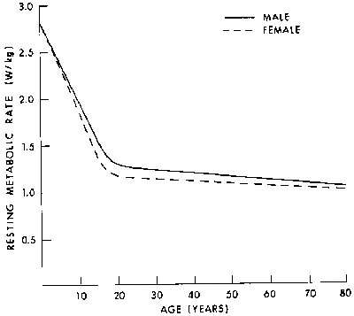 10.6. Variation of human resting metabolic rate, with age and sex, expressed as power per unit body mass