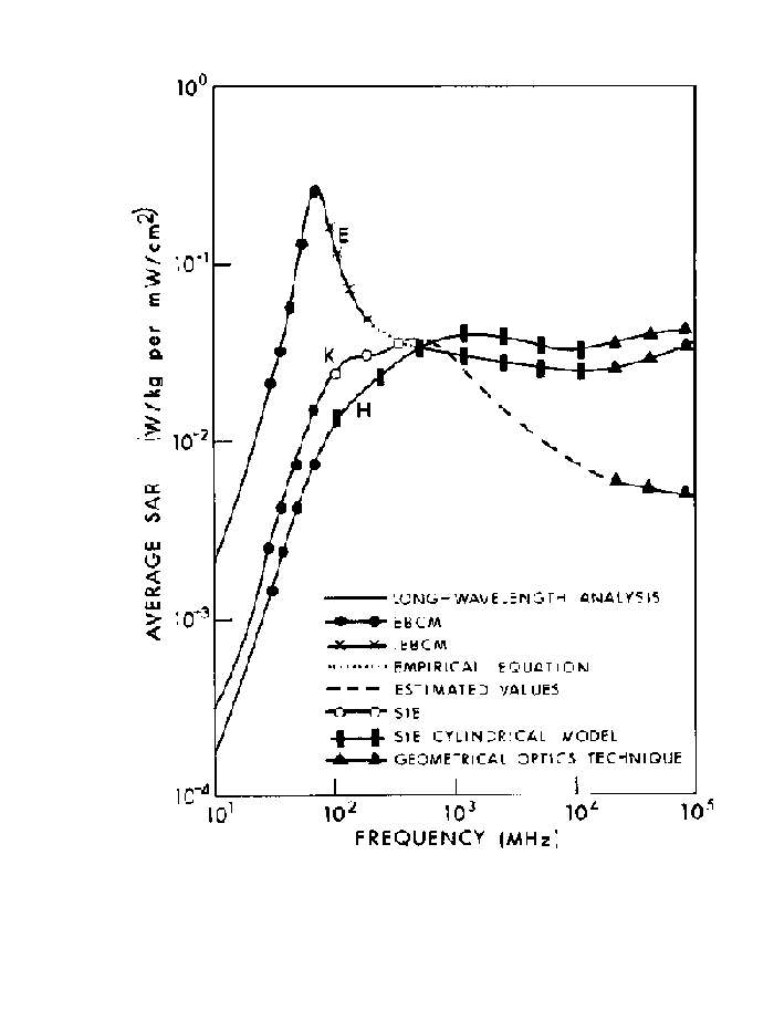 5.2. Average SAR calculated by the empirical formula compared with the curve obtained by other calculations for a 70-kg man in E polarization