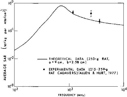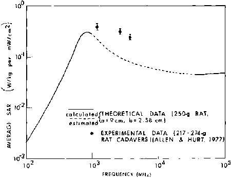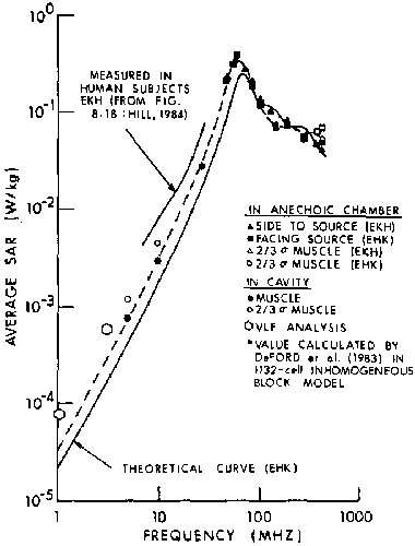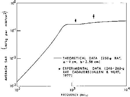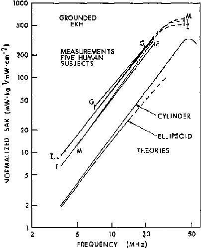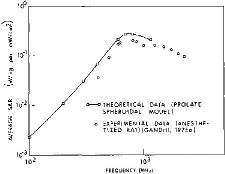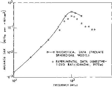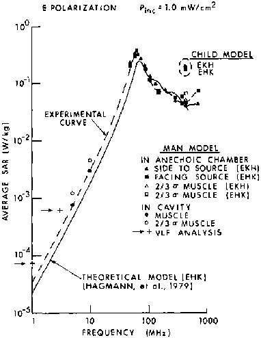 8.1A. Comparison of measured (experimental) and calculated (theoretical) SAR values for an average man in free space, E polarization