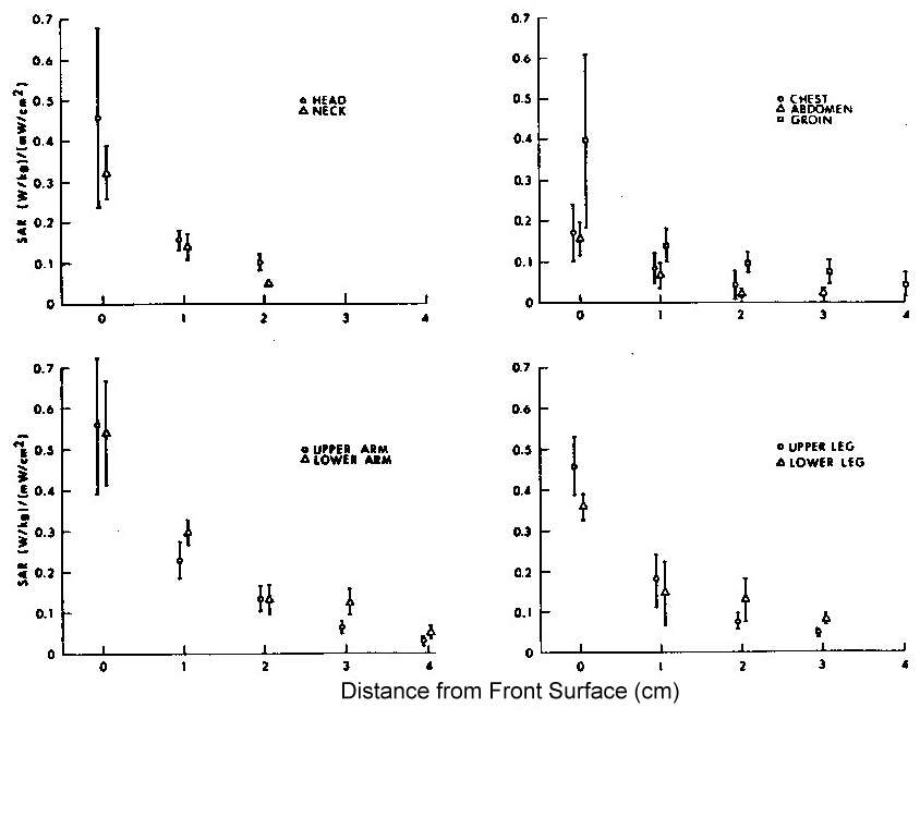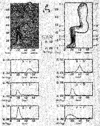 8.24. Normalized microwave absorption profiles in the man-sized model at 2.0 GHz