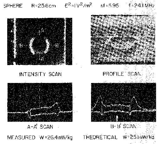 8.32. Thermographic results of exposing a 4.3-cm-radius sphere to 144-MHz TM110 electric field in a rectangular resonant cavity simulating a 25.6-cm-radius sphere exposed to 24.1 MHz