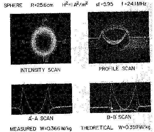 8.33. Thermographic results of exposing a 4.3-cm-radius sphere to 144-MHz TE102 magnetic field in a rectangular resonant cavity simulating a 25.6-cm-radius sphere exposed to 24.1 MHz