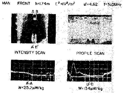 8.41. Computer-processed whole-body thermograms expressing SAR patterns for man with one arm extended, exposed to 1-mW/cm 2 450-MHz radiation with KEH polarization