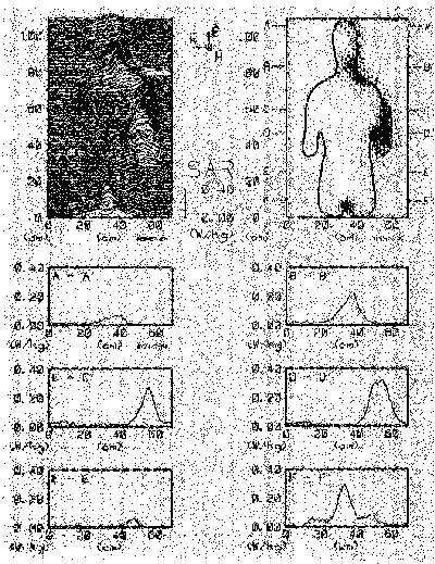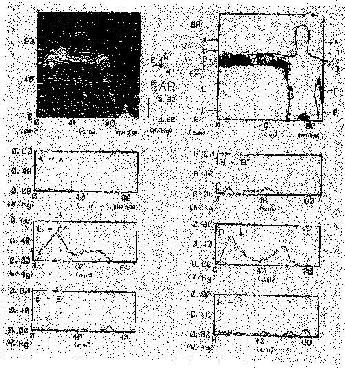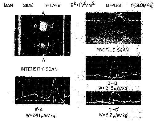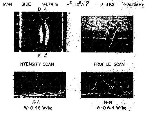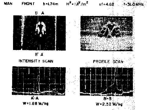 8.36. Scale-model thermograms and measured peak-SAR for 70kg, 1.74-m-height frontal-plane man model exposed to 31.0-MHz electric field parallel to the long axis