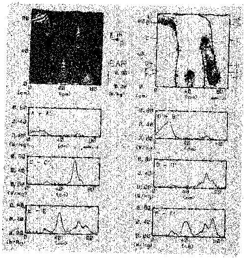 8.47. SAR distribution along an average man-model height for two cross sections; 1-mW/cm2 incident-power density on the surface of the model, frequency 350 MHz E||L back to front