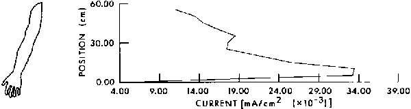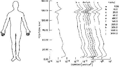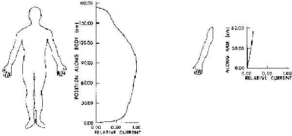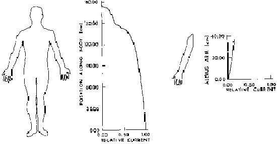 9.16. Calculated current distribution as a function of position in man with hand contacting a large object and with feet grounded. A 1-mA current is assumed to be flowing through the arm, thorax, and legs of the subject to ground, F = 60 Hz