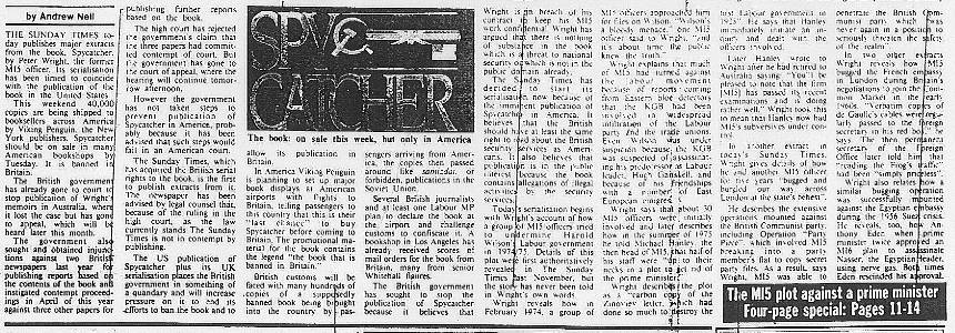 | Soon after the above article was published, the British Government sued the Independent and two other newspapers for contempt of court in ignoring the previous injunctions - this action was struck out. Finally on 12 July 1987 the Sunday Times published extracts from the book, as shown below. |
