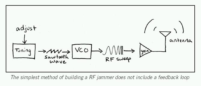 Implementing a DoS attack on RF in hardware is fairly straight forward, the design is essentially the same as that of what is being blocked except much noiser. The main components of a jammer are a voltage controlled oscillator (VCO), a tuning circuit for controlling the VCO so as to transmit into the desired RF band, a 'noise' source which may be built into the tuning circuit, an RF amplification circuit (otherwise known as a 'gain stage'), and an appropriate antenna. All of these components are now mass-manufactured as solid-state devices, are low cost (totalling under $50), and can be packaged into a portable device.