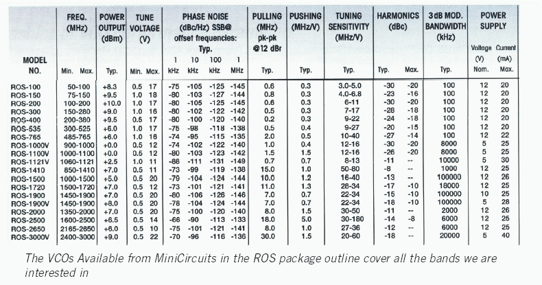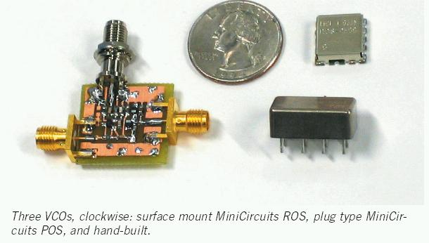 Low frequency VCOs (under 1 MHz) are somewhat simple to build using opamps, and are often implemented as RC relaxation circuits. High frequency VCOs (above 10 MHz) are more complicated in their design, and are often based on Clapp or Colpitts oscillators. Since we are concerned with RF in the range of 800 MHz up to 2.5 GHz, a wide-band, high-frequency VCO is desired. Inquiries into various VCO technologies have resulted in a three viable options: building a VCO from 'scratch,' purchasing a 'encased' VCO from an RF parts supplier, or using a VCO with built-in phase-locked loop (PLL, basically a feedback-driven tuning circuit) such as those available from Analog Devices.