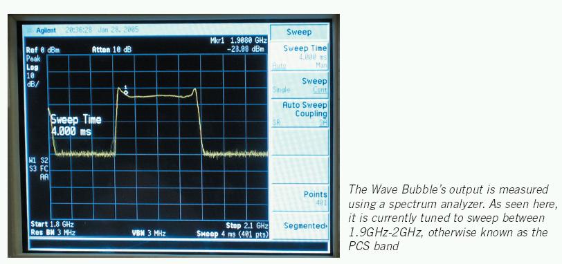 The Wave Bubble was designed and built during the spring term of 2004. Multiple revisions were tested against different cell phones with reasonable success. Older (2nd generation) cell-phones were easier to jam, likely because their output power is lower, and their receiving front-end less sensitive than those of current phones. Depending on the cell phone model, the effective zone of the bubble ranges from 1 to 2m. While the design is successful, there is a lot of work that needs to be put into Wave Bubble before it can be considered completed.