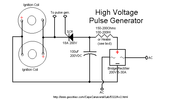 Here is probably the best ignition coil driver circuit that I have seen. As far as I know it was designed by Jochen Kronjaeger. You can find the original at Jochen's High Voltage Page This circuit is designed to run from 230V, but I have came up with a circuit that will run from 120V about just as well. You will need to find two ignition coils (preferably of the same type), a 100uF with at least a 200VDC rating, a full-wave bridge rectifer with a rating of about 5A at 200VDC. A large power resistor with at about 150-200ohms resistance and a power capability of at least 100W, or you can use an aquarium immersion heater. The next two things are optional, but they will make the project a lot more interesting. You might want to get about three 6A 200VDC SCRs. You can get these from Radio Shack. You might also want a simple square wave pulse generator. This can be just a simple 555 timer circuit. Make sure you can vary the frequency on it.