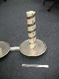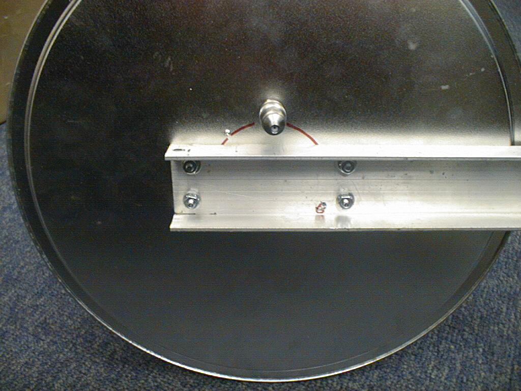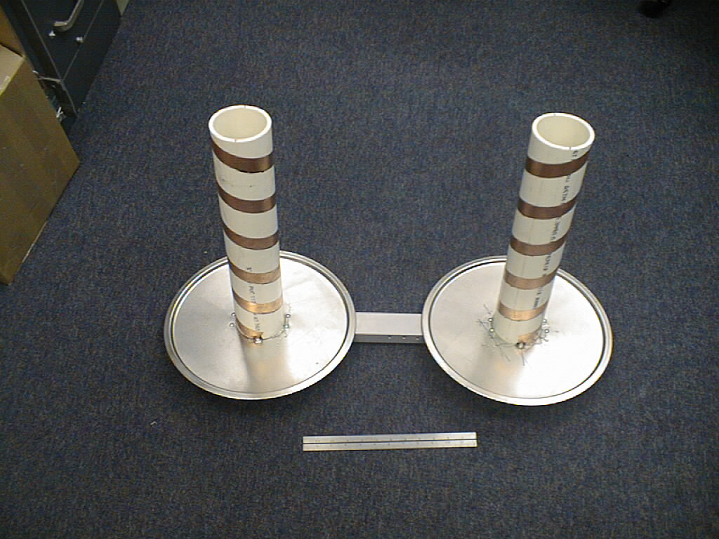For now, I've chosen to cut some lengths of 3" PVC Sch 40 pipe. (3.5 inches OD, 3.068 ID) 45 cm long ( a bit less than 18") and epoxy them to the steel pizza pans. A TNC connector is used to feed through and connect to the helix (it's a bit more rugged than an SMA, and they also match what I have for old cell phone antennas). The pair of ground planes are bolted with 10-32 machine screws (4 places) to a piece of 1"x2"x1/8" aluminum channel that is 2 feet long. It looks like some sort of science fiction death ray, and will probably get the "homeland security" folks after me. Upon an improvised stress test (I dropped it), the epoxy failed between the PVC and the steel (probably not enough epoxy in the right place, and not cured long enough). I'll re-epoxy it, and put some small screws into the PVC. [Note from 10 Nov, reglued, added some #4 wood screws, and it's pretty rugged, although with the heavy PVC pipe on it, the ground planes are now the "weakest link".]