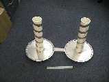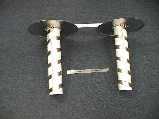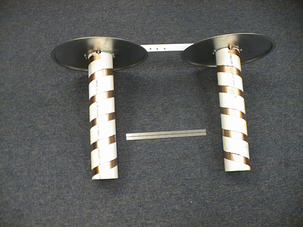 The basic design rules for helicals (in Kraus' book, or the ARRL antenna handbook) say that the circumference of the winding should be on the order of a wavelength (33 cm in this case). This works out to 10.5 cm, or about 4", a convenient size to wind. I found a 3" PVC coupling that is 103 mm OD, which served as a nice form. I had some AWG 10 (or is it 6?) bare copper wire that I wound on the form. It springs back a bit after winding, so the resulting coil is 110mm in diameter, which is certainly in the right range. A typical winding pitch is a quarter of a wavelength per turn, or, in this case, about 8 cm/turn (3 1/4 inches). I have 11 turns of the copper wire total, so if I split it into 5.5 turns per antenna, I can have a left and right pair. The approximate axial ratio is 2n/(2n+1), so I should get an axial ratio around 0.9. To make the opposite sense, I will have to rewind the coil though (slightly...)