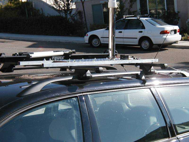 General side view of the installation, showing the plate and aluminum tubes. I mounted the screwdriver antenna at the back of the plate, figuring I didn't need ground plane for it, and that the car body would be the counterpoise anyway. Later, I can stick an NMO mount in the middle of the plate for VHF and UHF. Who knows what sort of interaction there will be between the UHF whip and that big old pipe behind it?