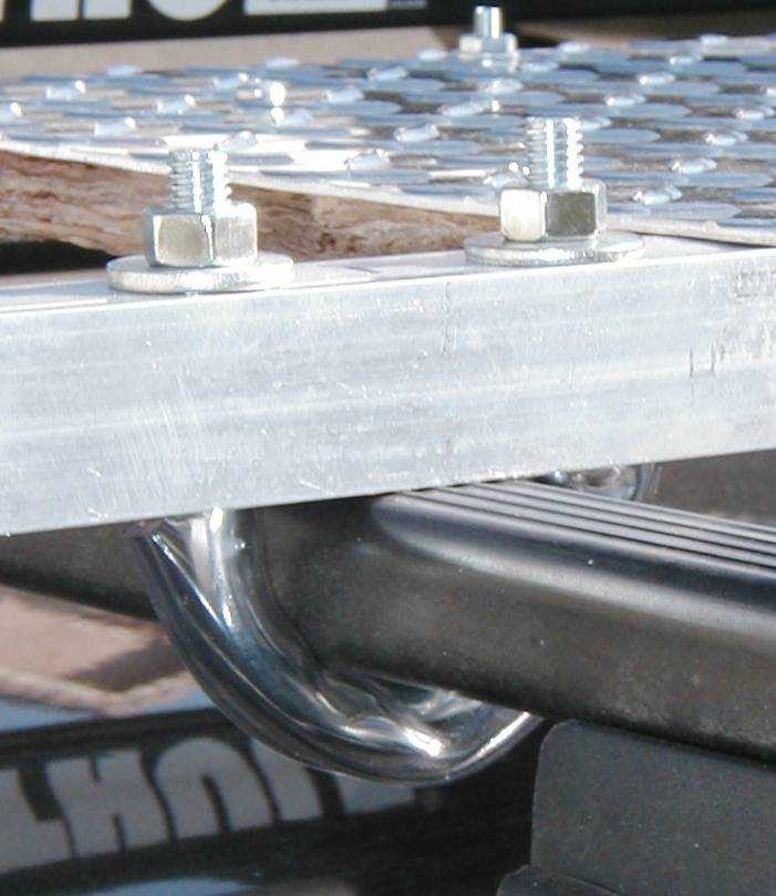 Detail of the U-bolt clamps. They're 5/16" bolts with 2" between the legs, which nicely straddles the bar of the Thule rack. I put vinyl tubing over the bolt for "anti squeak" and to protect the finish on the Thule rack. A bit of Loctite on the nuts will keep them from vibrating off.