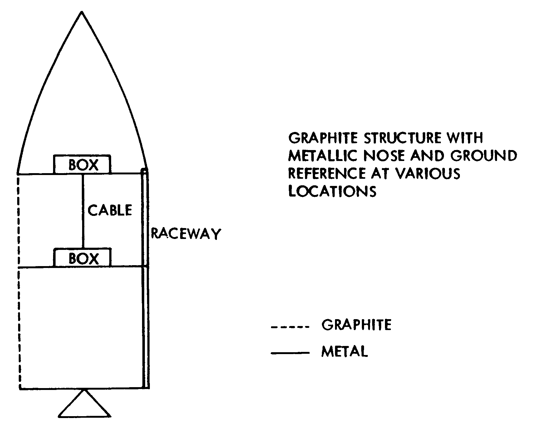 The rocket considered here is composed of mostly graphite composite material. From the lightning threat viewpoint, all metal construction offers the best protection. However, since weight and cost are dominant design factors, composite material has found increased importance in its application. The worst case example considered will include a conductive nosecone, a conductive strip running the length of the rocket (the raceway), and various stage or other reference ground planes along the rocket structure. This condition is shown in Figure 1.