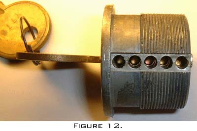 Going back to figure 12 for a sec. If I got out my micrometer and measured each overlap I would notice that the distances away from the cylinder body would not be consistent. What I mean by this is: If I drew a straight line across these columns, the point at which the cylinder holes make contact with the line would not be exactly parallel. This is due to the inherent play between the cylinder and the cylinder body. In order for the cylinder to spin there must be an allowance for movement. When a key ( or something simulating a key ) is inserted and turned there will be side pressure on the cylinder causing it to skew and create this situation.