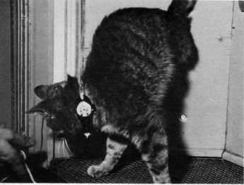 If, however, we tried to prevent the evoked effect by holding the left hind leg with our hands, the cat stopped purring, struggled to get free, and shook its leg. Apparently the evoked motility was not unpleasant, but attempts to prevent it were disturbing for the animal, suggesting that stimulation produced not a blind motor movement but also a desire to move, and the cat cooperated spontaneously with the electrical command, adjusting its posture before performing the leg flexion. It was evident that the animal was not in a hurry and took its time in preparing for the induced movement. Preliminary adjustments were not seen if the cat's posture was already adequate for the leg flexion. In cases of conflict between the spontaneous movements of the animal and those elicited by the experimenter, the final result depended on the relative strength of the opposing signals. For example, if the cat was walking, threshold stimulations of i.2 milliamperes for slight leg flexion were ineffective. If the cat was stimulated while jumping off a table to reach food, stronger intensities of up to 1.5 milliamperes, which usually evoked a clear motor response, were also ineffective; physiological activity seemed to override the artificial excitation and the cat landed with perfectly coordinated movements. If the intensity was increased to 2 milliamperes, stimulation effects were prepotent over voluntary activities; leg flexion started during the jump, coordination was disrupted, and the cat landed badly. A similar experiment is described on page 186.