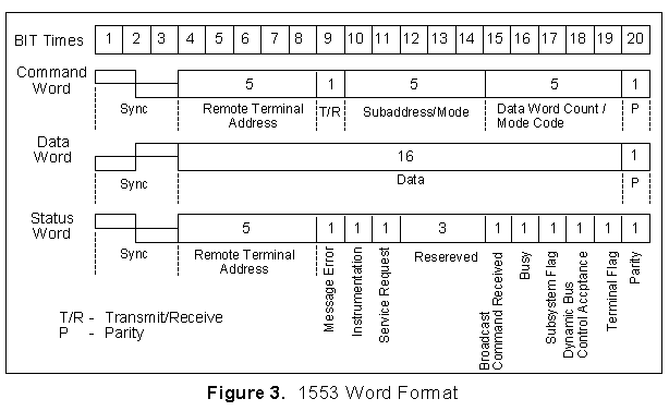 There are 20 1.0-microsecond bit times allocated for each word. All words include a 3 bit-time sync pattern, a 16-bit data field that is specified differently for each word type, and 1 parity check bit.