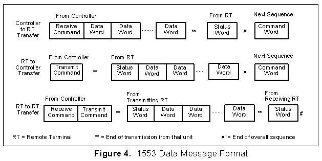 The normal command/response operation involves the transmission of a command from the BC to a selected RT address. The RT either accepts or transmits data depending on the type (receive/transmit) of command issued by the BC. A status word is transmitted by the RT in response to the BC command if the transmission is received without error and is not illegal.
