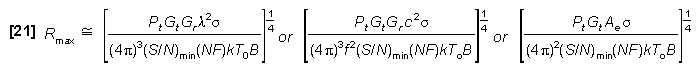The Radar Equation is often called the "Radar Range Equation". The Radar Range Equation is simply the Radar Equation rewritten to solve for maximum Range. The maximum radar range (Rmax) is the distance beyond which the target can no longer be detected and correctly processed. It occurs when the received echo signal just equals Smin .